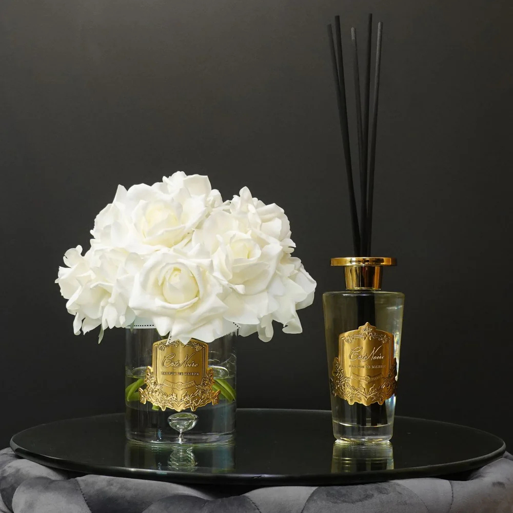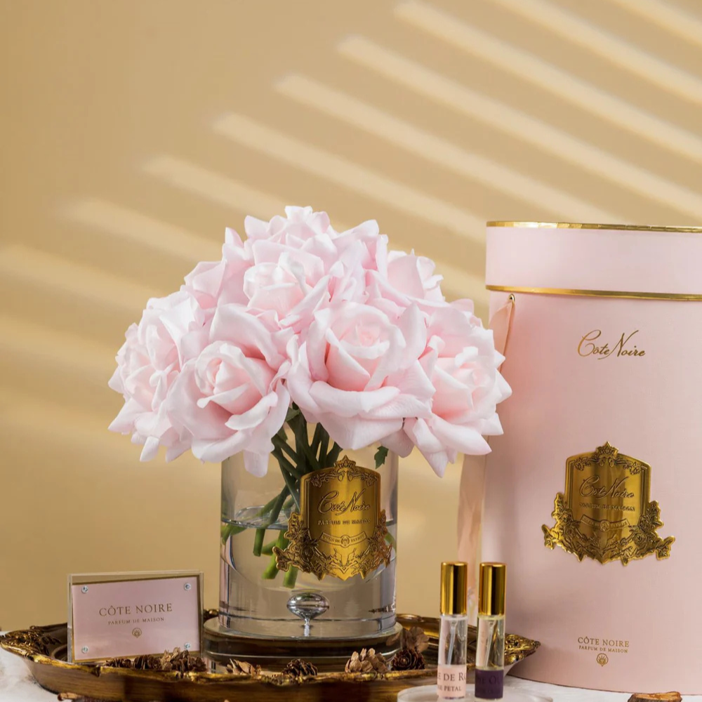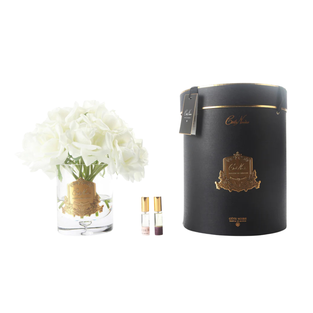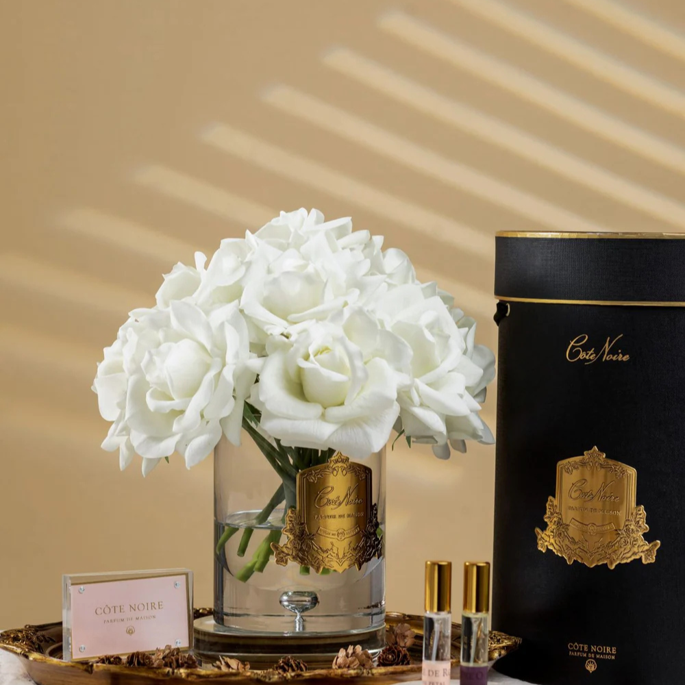 Each life-like perfumed Luxury Grand Bouquet has been skillfully hand crafted and is set in gel giving it the appearance of water. Each petal has a special natural coating to give them a true to life touch & appearance. Thirteen roses have been arranged in a luxury vase with a gold Cote Noire signature badge.