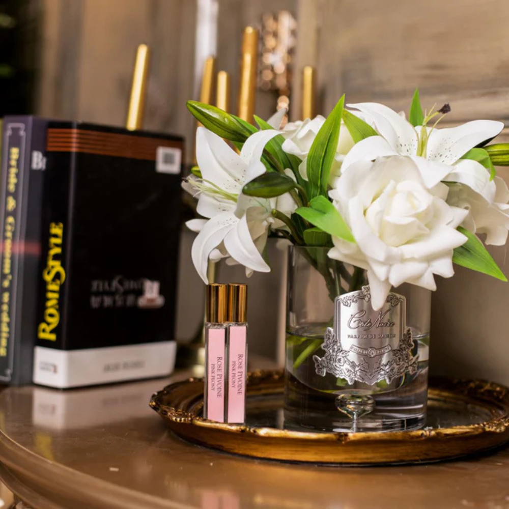 Each life-like perfumed Luxury Lilies & Roses Bouquet has been skilfully hand crafted and is set in gel giving it the appearance of water. Each petal has a special natural coating to give them a true to life touch & appearance. Arranged in a hand-blown glass vase with gold Cote Noire signature badge.