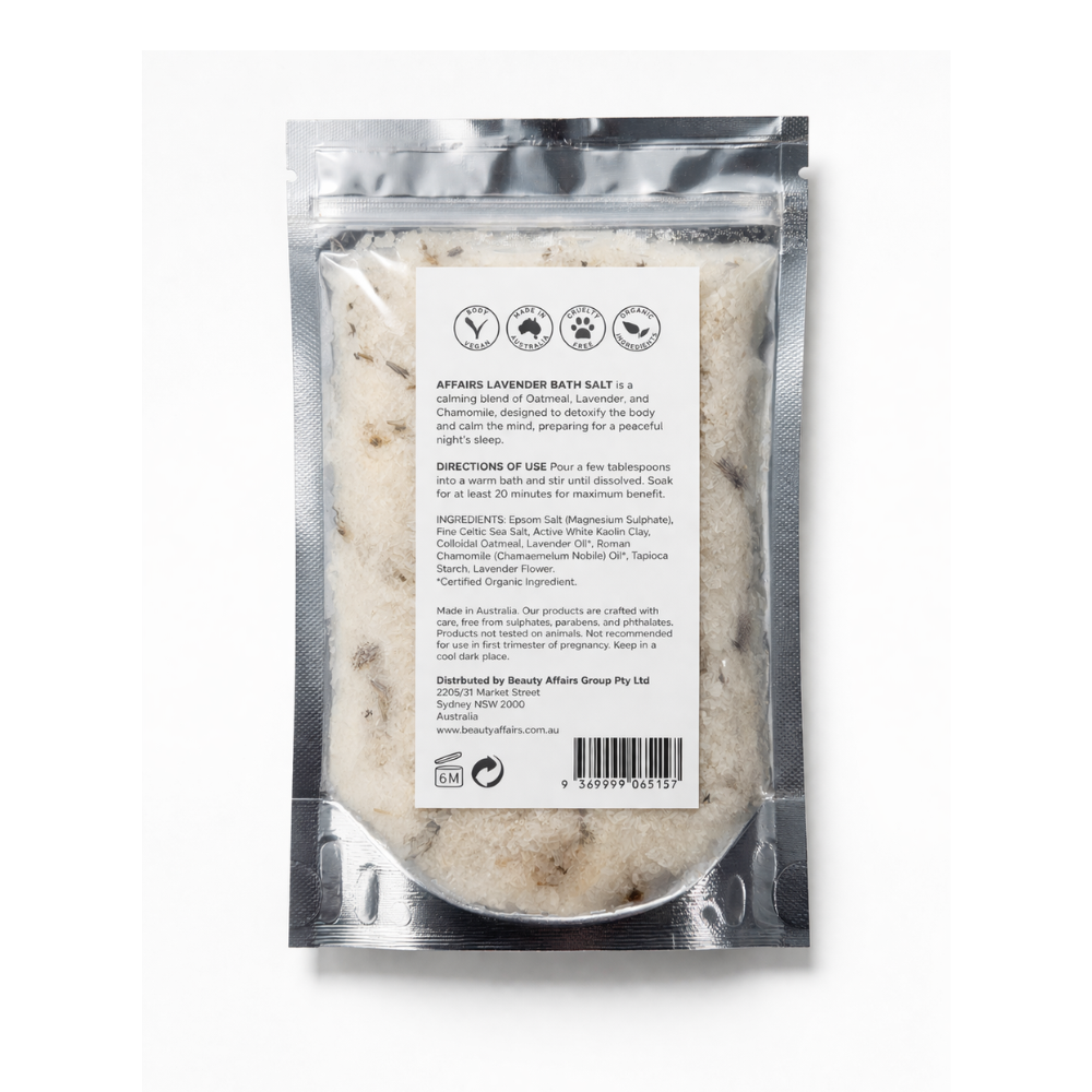 Affairs Luxury Bath Salt is the ultimate end-of-day ritual for anyone looking to truly unwind - a beautifully crafted blend of Epsom Salt, Celtic Sea Salt, and soothing botanicals that detoxifies the body and prepares both body and mind for a peaceful, restorative sleep. Magnesium-rich Epsom Salt works hard to draw out impurities and ease tension, whilst fine Celtic Sea Salt and Active White Kaolin Clay gently purify and soften the skin.