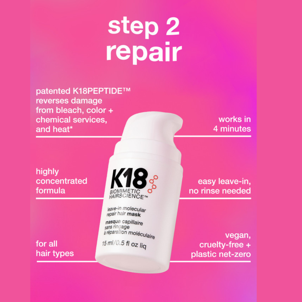2. Apply 3-9 pumps of K18 leave-in molecular repair hair mask based on your length and density, starting at the ends and working up towards the roots