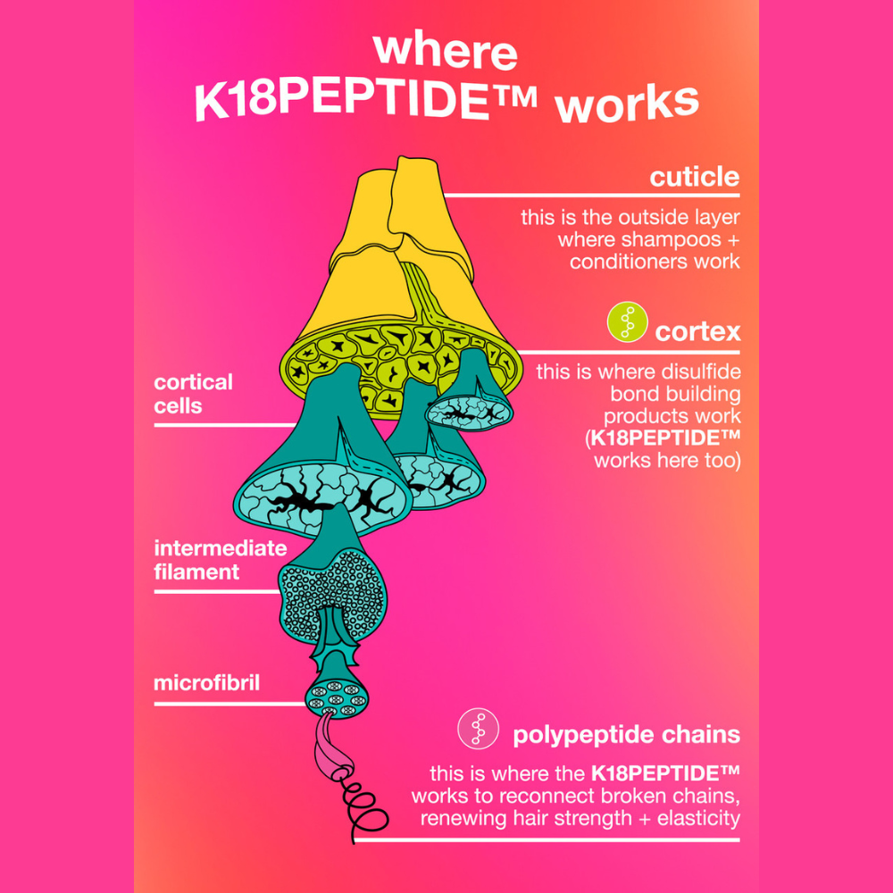 Water (Aqua) (Eau), Alcohol Denat., Propylene Glycol, Cetearyl Alcohol, Dicaprylyl Ether, Cetyl Esters, Behentrimonium Chloride, Polysorbate 20, sh-Oligopeptide-78 (K18PEPTIDE™), Hydrolyzed Wheat Protein, Hydrolyzed Wheat Starch, Isopropyl Alcohol, Tocopherol, Phenoxyethanol, Potassium Sorbate, Citric Acid, Fragrance (Parfum), Geraniol, Linalool, Hexyl Cinnamal, Benzyl Alcohol.